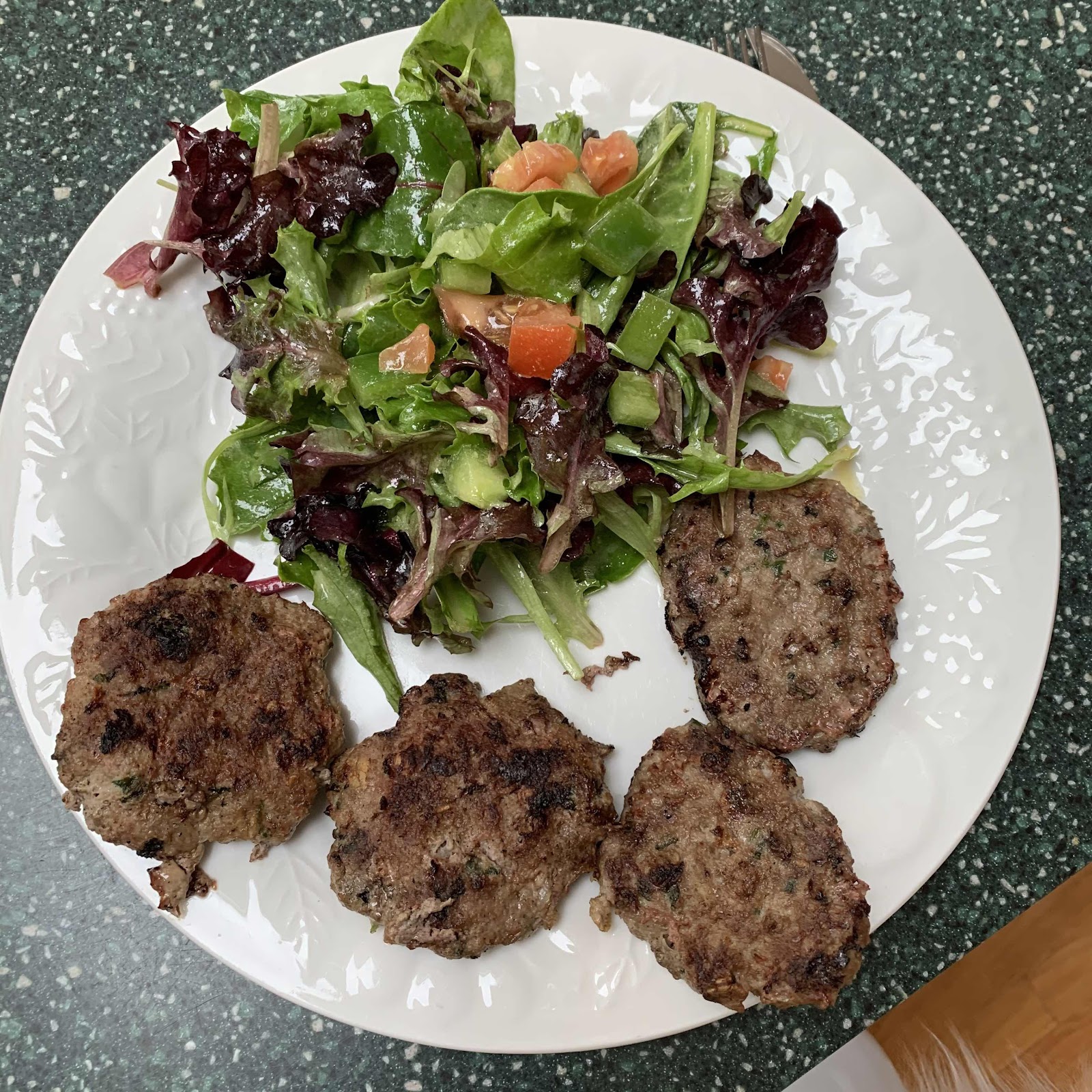 Mix onions, eggs, olive oil and oats first. Let them sit for 4-5 minutes. Then add everything else. Turn into round flat meatball shapes. Lay them in a baking paper lined container with baking paper in between layers. Grill or cook in a pan. Be careful and gentle as they are pretty delicate when uncooked. They can stay in the fridge for a day or two.