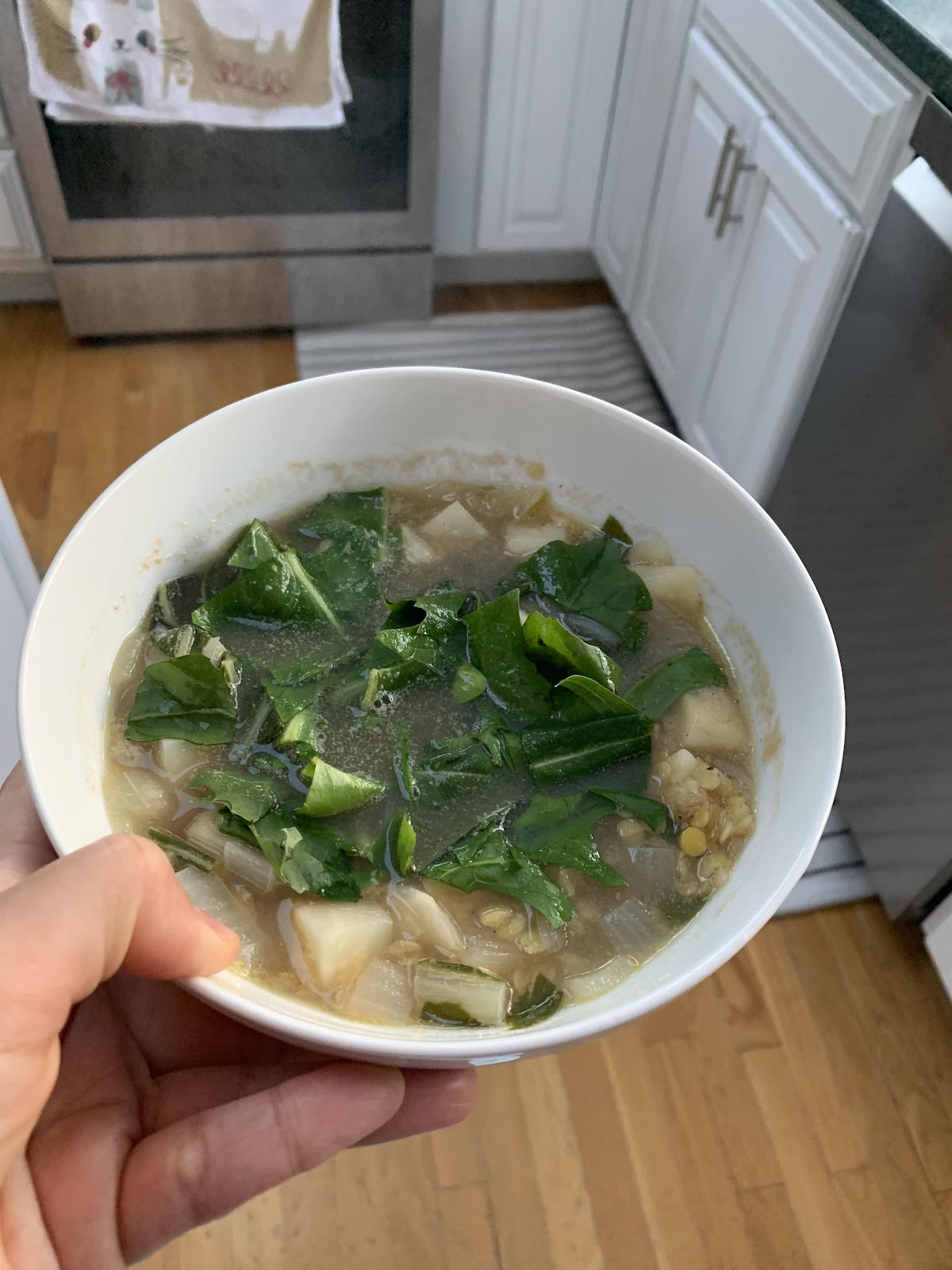 Place everything except dandelion greens in a large pot. Cook in medium heat and let it rest when all veggies are cooked. Smooth with your hand blender (or not). Place a few dandelion greens in the bowl when serving.