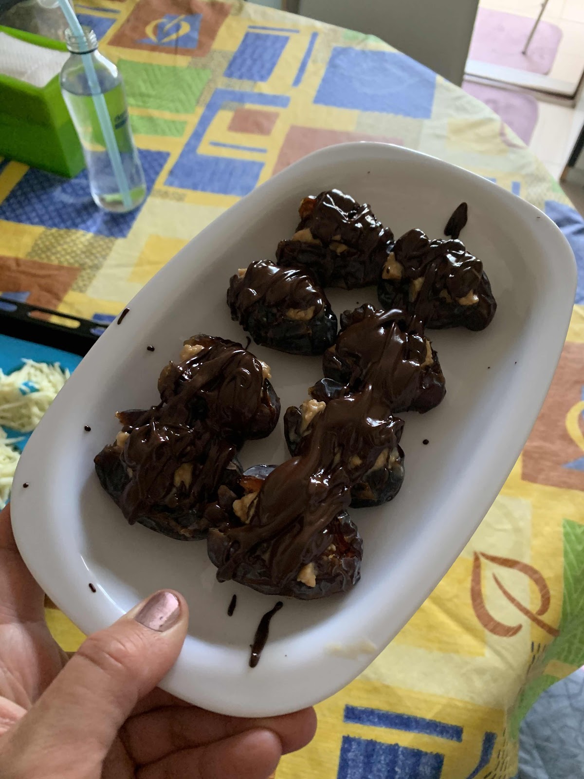 Take the seeds out of the dates. Fill them with peanut butter. Drizzle with melted dark chocolate. Refrigerate.